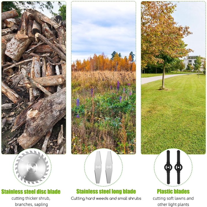 - Versatile Blades: Comes with three types of blades five ABS blades for soft lawns, two stainless steel long blades for hard weeds, and one stainless steel round blade for shrub branches