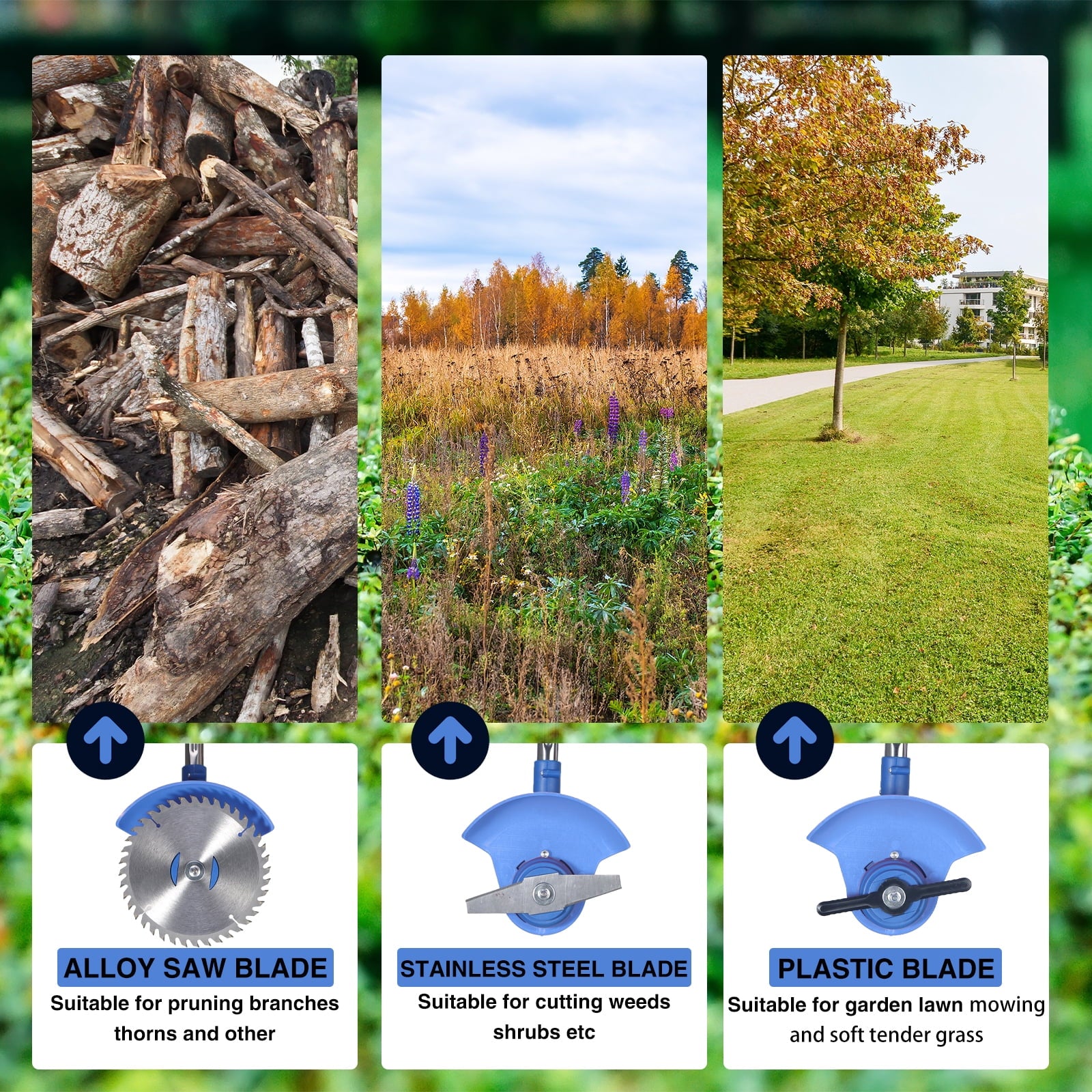 - More applications: Jinyi trimmer is suitable for trimming thorny shrubs, small vines and saplings in gutters (equivalent to trimmers and mini chainsaws), the unique S-shaped blade is more suitable for trimming ground weeds, corners and lawn edges and Difficult-to-clean light-duty mowing areas or as an aid in heavy-duty mowing